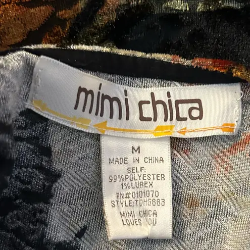 Mimi Chica Floral Print Burnout Crushed Velvet Open Front Long Cardigan Size Medium Long duster style short sleeve sweater. This is in excellent preowned condition. No flaws to note. Items shipped same or next day. Weekend orders shipped Monday.