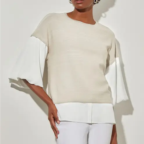 Ming Wang Tan Mixed Media Puff Sleeve Knit Blouse Size Small Excellent condition Approximate measurements: Length: 27.5” shoulder to hem Bust: 46” Elevate staple attire with the bold, artistic construction of our puff sleeve blouse. This fresh neutral top features a unique mixed-media design with statement puff sleeves for a voluminous detail that surely captures attention. Crafted with meticulous attention to detail, it seamlessly blends contemporary flair with timeless elegance, making it the perfect addition to your wardrobe for both casual and formal occasions alike. Drop Shoulder Puff Sleeves; Jewel Neck; Pullover; Side Slits Fade & Stretch Resistant to Hold Its Shape and Color Soft Knit: 52% Rayon / 48% Polyester