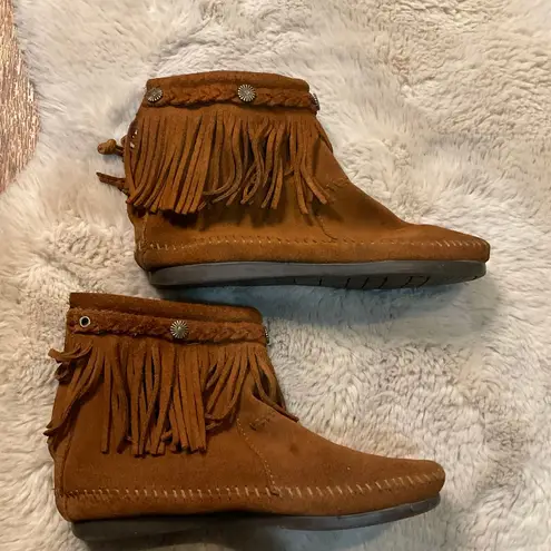 Minnetonka Five Layer Fringe Bootie Suede High Top Back Zip Ankle Boots Moccasin, have some marks on... Show more
