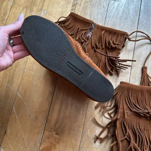 These Minnetonka ankle booties in a rich brown hue feature a stylish fringe detail that adds a touch... Show more