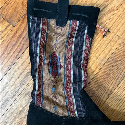 Great used condition Suede and fabric upper Calf High Black suede trim Bead details on drawstring s... Show more
