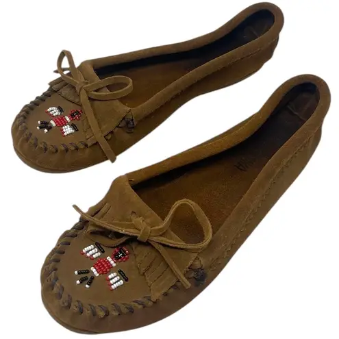 This is a pair of slip-on moccasins from Minnetonka in a womenโs size 8. These shoes are in good con... Show more