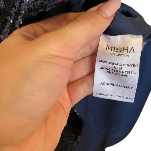 This eye-catching Avery Sequin Dress is sleek and sexy! Misha's dazzling navy dress features a timeless silhouette, low scoop back and seductive thigh high split. We adore the elegant simplicity of this style. Form fitting and guaranteed to flatter every body type! Details: Sequin throughout Scoop neckline and low back Sleeveless; adjustable spaghetti straps Sheath silhouette Hidden back zip Thigh high front left slit Midi-length hem Polyester/spandex New without tags. Excellent condition. Tags: cocktail dress, formal, party, special occasion, wedding guest, bachelorette, electric love, embellished, sparkle