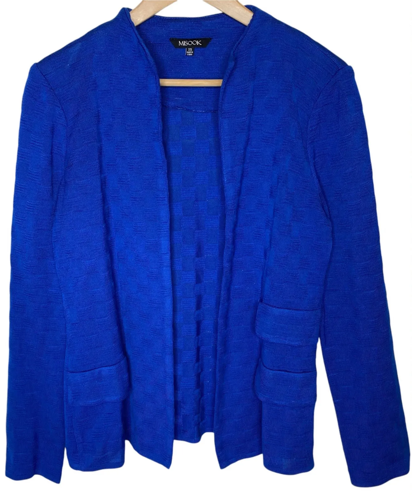 Misook Textured Knit Open Front Jacket Blue size XS In great pre-owned condition! No blemishes - shoulder pads have been removed. See last photo. Round neck Open front Faux flap pockets Royal blue Check pattern textured knit Wrinkle free knit fabric 90% Acrylic, 10% Polyester Measurements: 18.5in underarm to underarm 25in shoulder to hem 16in shoulder to shoulder 24.5in sleeve length luxury, office, career