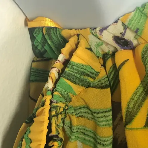 Miss Avenue jungle print jumpsuit in Size Small, in excellent pre-owned condition (worn only once). Features a vibrant yellow tropical print, off-shoulder neckline with elastic for comfort, and a flirty open back. Includes a self-tie belt to cinch the waist, button cuffs, and full lining for quality and comfort. Made from 100% polyester, easy to care for and perfect for summer parties, vacations, or statement looks. Approximate flat lay measurements: pit to pit 13.5”, length 56”, sleeve length 20”, waist 12.5”. Miss Avenue jumpsuit, jungle print, off-shoulder jumpsuit, open back outfit, self-tie belt, summer jumpsuit, statement jumpsuit, bold fashion, size small women’s clothing. #MissAvenue #JunglePrint #OffShoulderJumpsuit #OpenBackStyle #SelfTieBelt #StatementOutfit #SummerFashion #BoldStyle #WomensJumpsuit #SizeSmall #FashionFinds #PreownedStyle