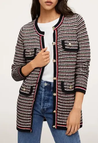 Knitted fabric with gold textured buttons flap pockets. Horizontal stripes in black white and brown,... Show more