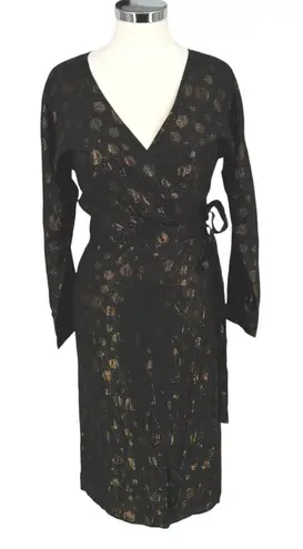 A stylish wrap dress with a metallic polka dot pattern, adding a touch of elegance to any wardrobe.... Show more