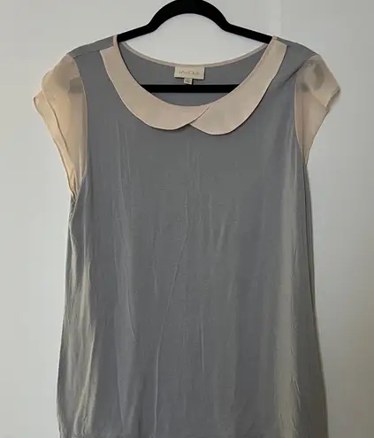 This is a ModCloth Peter Pan collar top in gray modal with sheer cream chiffon cap sleeves and colla... Show more