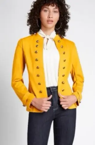 military style blazer, mustard yellow blazer, ModCloth jacket, structured knit blazer, statement button blazer, vintage inspired jacket, fall layering piece, glam believer blazer, women’s medium blazer, military style, structured, statement buttons, bold color, tailored, collarless, epaulette detail, fall fashion, polished, vintage inspired, chic, edgy, smart casual, workwear, trendy, modern classic, versatile layering piece