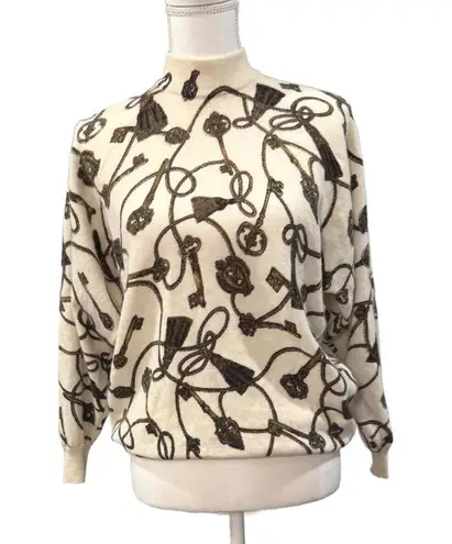 Cream sweater featuring an all-over brown key and tassel pattern. Wool Blend fabric with a relaxed fit and long sleeves. Ribbed cuffs, neckline, and hem for a comfortable fit. Perfect for casual wear or layering in cooler weather.