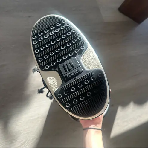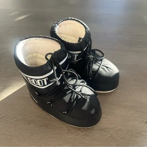 Inspired by the 1969 lunar landing, Moon Boot's imitable "Icon" boots riff on high-technology astronaut gear and are crafted from insulated, water-repellant nylon with suction pads on the rubber tread sole for added traction Ambidextrous Boot shaft, approx. 12"H Flat heel Round toe Criss-cross tubular laces Self-tie drawstrings at the collar Logo-printed side panel PVC heel counter and trim Pull-on style Multisize foam lining Thermoplastic midsole Rubber tread outsole Made in Romania worn once last winter SIZE 7-8.5 (39-41)
