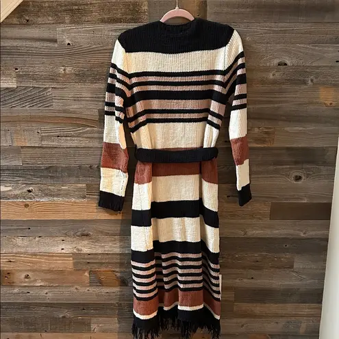 NWT Moon River Long Cardigan, size Small. This is brand new with the tags still attached and no call outs. The fabric is super soft Chanel. There is a removable black belt with fringe, along with fringe at the bottom hem line. Measurements taken flat and are approximate. Pit to pit 21” Length 45”