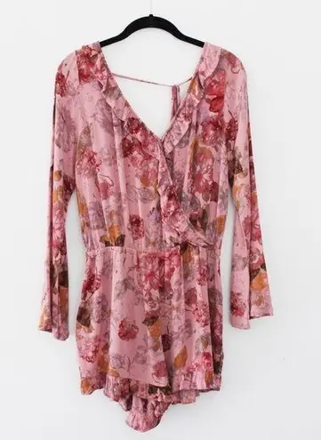 Mossimo Supply Co. pink, floral, long sleeve romper. Wrap design. Ruffle detailing. Wide sleeves. V... Show more