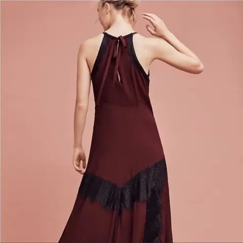 Moulinette Soeurs Janie Lace Halter Dress in Purple Black Size 2 Excellent Used Condition Material: 97% Viscose, 3% Spandex Features: Empire waist, fitted bodice, halter style neckline, tie at back of neck, solid wine purple color, black lace trims, v pattern lace trim on front and back of skirt, zipper and double button closure, midi length, a-line silhouette, keyhole back. No trades, offers welcome!