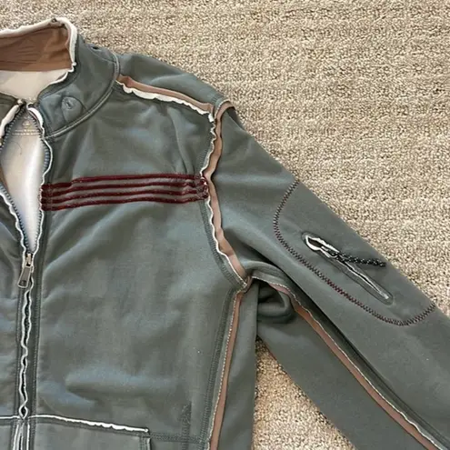 - Factory distressed look - 2 side hand pockets - Thumb holes on cuffs - Ribbon detail on right sleeve - Lightweight with slight fleece lining Size: Large Pit to pit: 20” Length from shoulder to hem: 25” Sleeve length: 27.5”