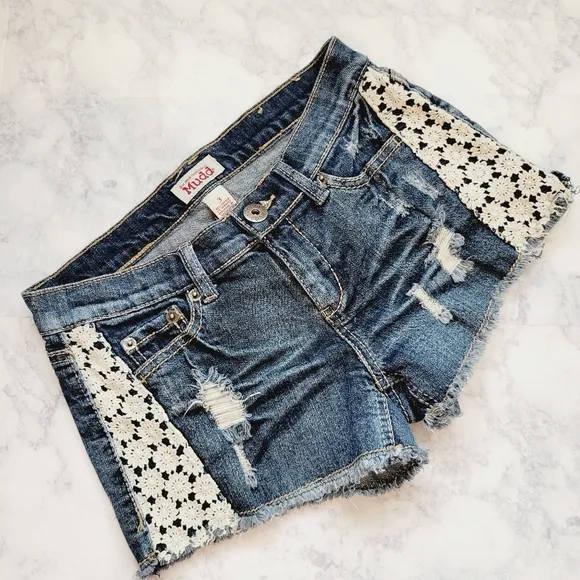 Bohemian vibes are given off on these distressed lowrise cutoff denim shorts with daisy lace panels.... Show more