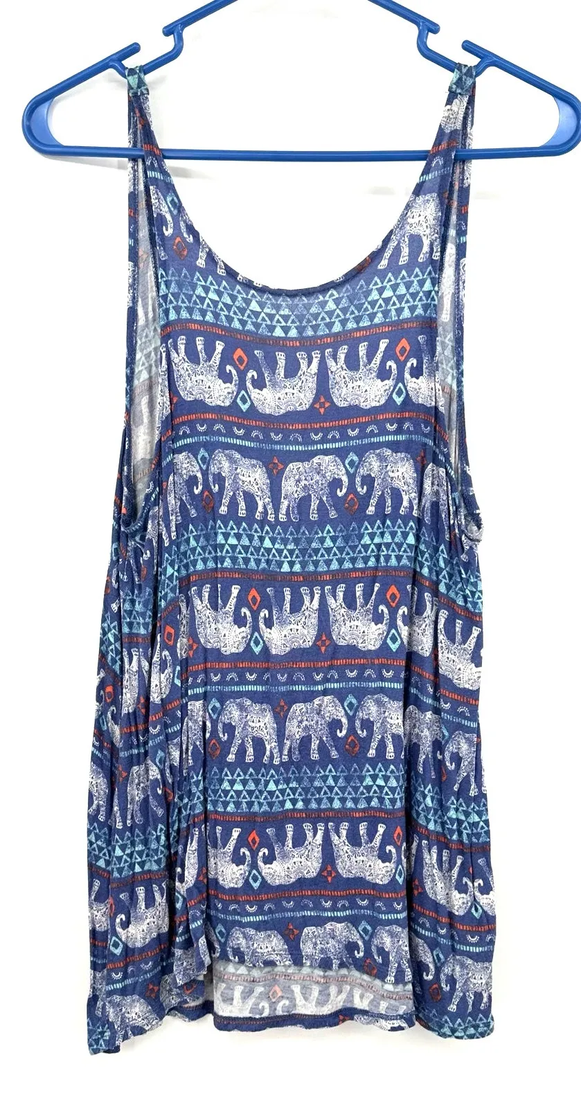 Mudd Size Small Tank Top Sleeveless Shirt Blouse Top Low Cut Scoop Back Blue and White Elephant Pri... Show more