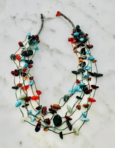 Multi-Stone Chip Bead Necklace-Boho Layered Style Add a pop of color and earthy charm to your look with this multi-strand necklace featuring a vibrant mix of genuine stone chips. With rich tones of turquoise, coral, black onyx, and more, this natural beauty is perfect for a bold boho vibe of layered festival style.
