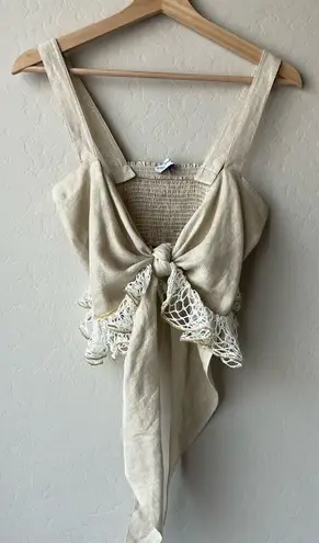 My Beachy Side tan lace knit crochet cropped tank top. With a bow tie knot at front, this is the perfect beach or pool party blouse to throw on and go. Smocked back for added stretch. Thin shoulder straps. Thin metallic stripes. Tan and white crochet net. No care tags. One size fits most. Excellent pre-owned condition, no major flaws to note. Approximate measurements: Shoulder to hem: 18 inches. Pit to pit: 14 inches across. B1.