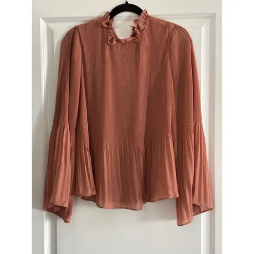 Flowy and feminine Naked Zebra blouse in a warm rust tone. Features a soft ruffled mock neckline, pl... Show more