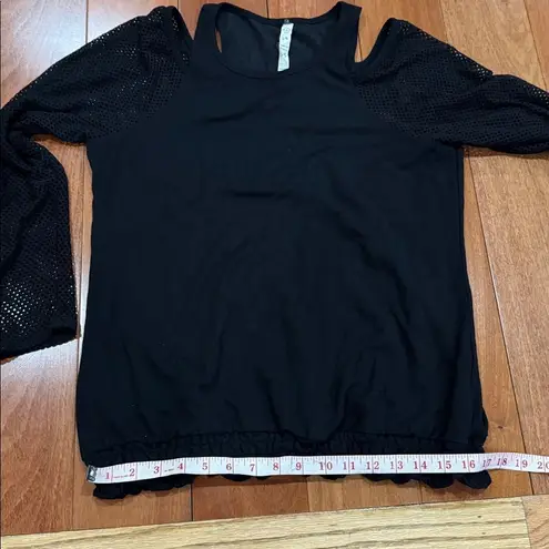 in excellent condition. Elegant black blouse with mesh sleeves. Features cold shoulder design. Idea... Show more