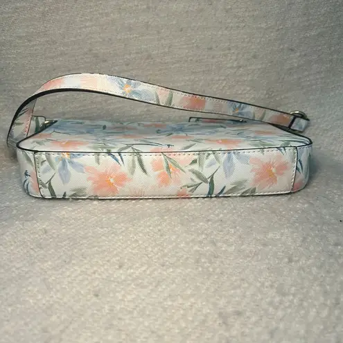 Beautiful floral print shoulder bag from Nanette Lepore featuring a watercolor-style pattern of coral and blue flowers with green leaves. Single adjustable shoulder strap, zip-top closure, and silver-tone hardware. Perfect for spring and summer occasions, brunch dates, or garden parties.