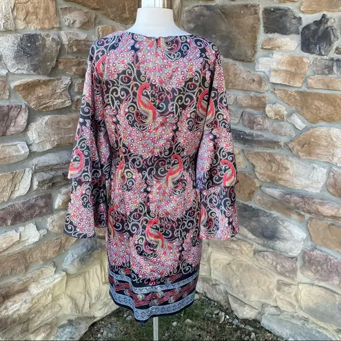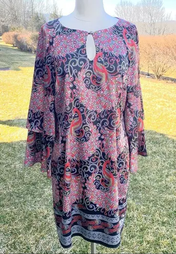 Boho Printed shift dress 3/4 layered bell sleeves Keyhole front Knee length Fully lined EUC Approx... Show more