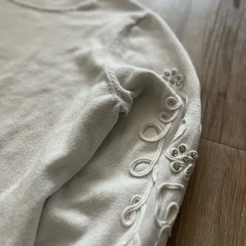 Elegant white sweater featuring embellished sleeves from nanette lenore. in used condition but lots... Show more