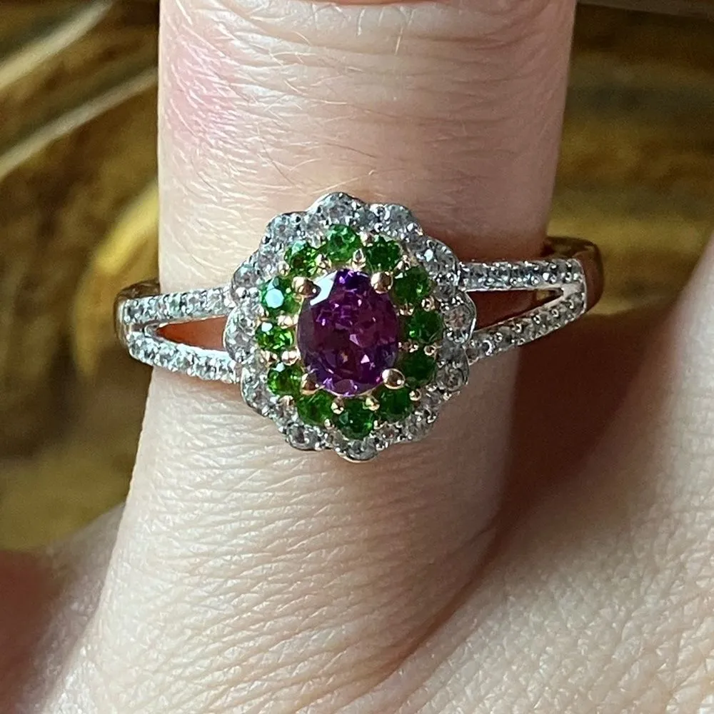 This beautiful ring features completely natural, earth mined garnet, chrome diopside, and white zirc... Show more