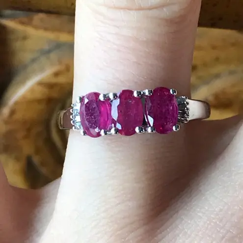 This elegant ring features natural, earth mined rubies and natural diamond accents. The rubies are fissure filled, and the diamonds are completely untreated. The total carat weight on this one is 2.20, with the rubies measuring 6x4 mm. The ring is set in solid .925 sterling silver with a rhodium finish. This ring would be perfect for daily use. The ring in the photos is the actual one you will receive, so please see photos for gemstone quality and measurements. Size 8. J5