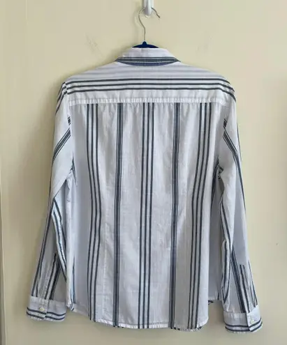 Nautica Button down blouse White with blue stripes Size large 100% cotton Linen look/feel Material... Show more