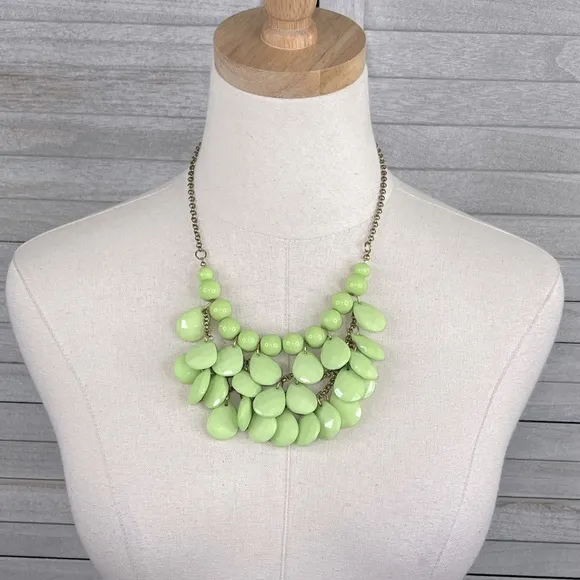 Gently used beaded statement necklace in light green. Has faceted teardrop shaped beads and smooth r... Show more