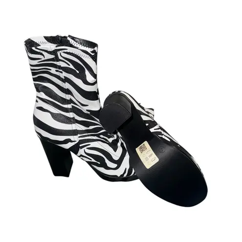 zebra print ankle boots! Bold black-and-white stripes on textured vegan leather, paired with a sturd... Show more
