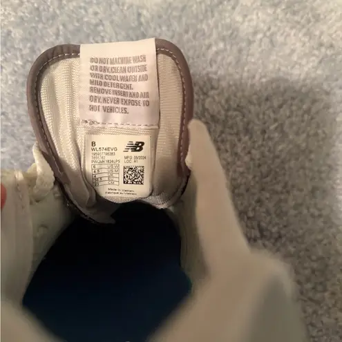 New Balance 574 sneakers with a cream exterior and navy interior. Stylish and comfortable design.