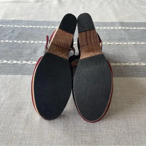Free People Cedar Wooden Clog Heels Burgundy Maroon Rich suede clogs on a woodgrain platform and he... Show more