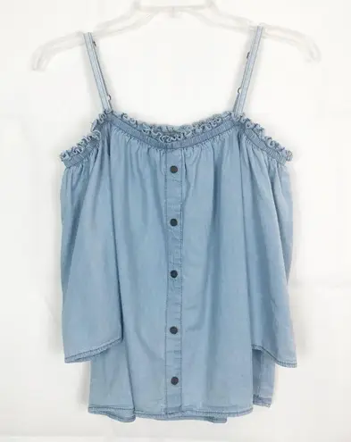Strap cold shoulder denim top in blue. Wide sleeves. Button down. Adjustable straps. 100% cotton. In good used condition. No stains, tears or holes. Approx. Measurements: pit to pit 20" length 20" from elastic to hem.