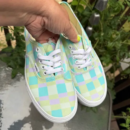 Vibrant Vans sneakers with a plaid pattern. Features green, blue, and yellow colors. Ideal for playf... Show more