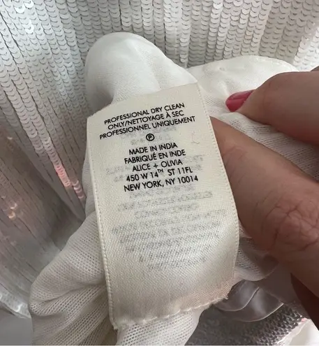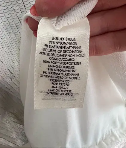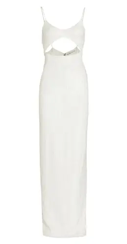 is such a stunning piece! This spaghetti strap gown features a front cutout detail, tonal sequin embellishment throughout and a back slit. Back zip closure. Self 91% nylon, 9% elastane. Contrast Fabric 100% polyester. Lining 91% nylon, 9% elastane.