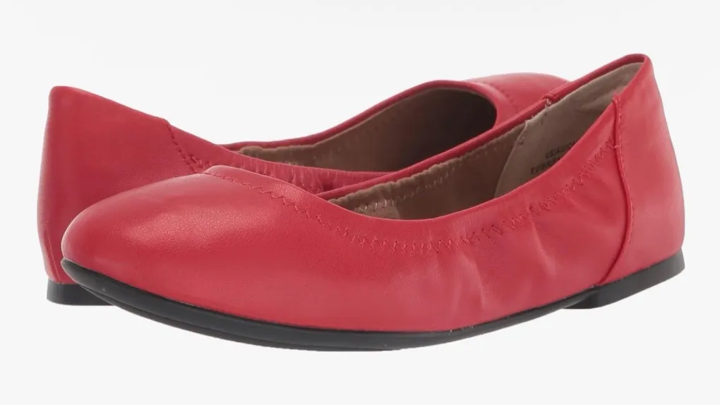 Bright poppy red Sole material Thermoplastic Rubber (TPR) Shaft height Low-top Outer material SYNTHETIC Closure type Pull-On About this item COMFORT AND FIT: These ballet flats have a padded insole with high-quality memory foam for added comfort and a heel pillow to relieve pressure and heel slip. The elasticated topline ensures a perfect fit MATERIAL: Amazon Essentials shoes are made from high-quality alternative leather materials. This style has a super soft faux calfskin upper and is lined in faux suede with a leather heel lining. STYLE: These ballet flats have a stylish round toe and a modern upper design. DETAILS: 1/4 inch heel with a flexible non-slip sole. DESIGN: These ballet flats take you from day to night and can be paired with your favorite Amazon Essentials outfit.
