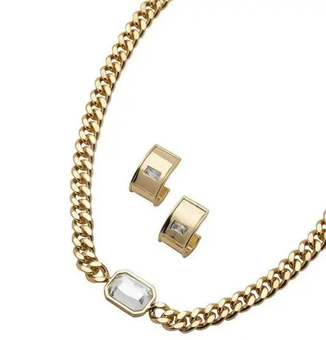 Add some shine to your stack with this glamorous bezel-set crystal housed in a chunky, glistening chain. Elegant matching set that includes a collarbone-accentuating chain necklace and earlobe-hugging hoops, both in 14k gold plated brass.