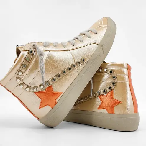 RiRi hi-top sneaker in size 11 brand new in the box. Color is champagne Side zipper Lace up Stud detail Star detail Slightly smudged sole (intentional) RIRI merges vintage sneakers with a cool rock 'n roll attitude. Crafted from faux leather and detailed with metallic studs, these high-top sneakers deliver a hardcore blend of retro style and cool. Wear yours with everything from dresses to jeans. Nonsmoking home #retro #shushop #shoeshop #sneakers #hightopsneakers #tennisshoes #retrostyle #studs #studdetail #metallic #goldstuds
