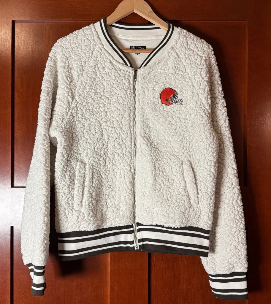 NFL Team Apparel jacket with logo. Features brown and white striped trim. Cream teddy fabric. Clevel... Show more