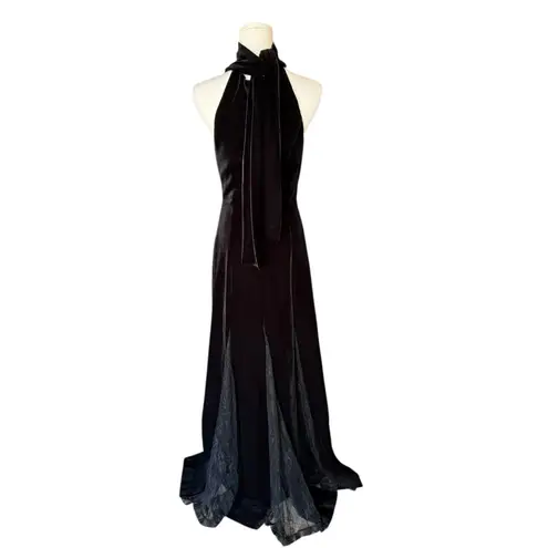 NICHOLAS NEW WITH TAGS SIZE: 6 Self: 90% poly, 10% spandex Lining: 100% poly Made in Australia Dry clean only Fully lined Velvet fabric Front cut out with neck tie accent Hidden back zip closure Lace fabric detail MEASUREMENTS: Bust: 14” Length: 62” ***all measurements are approximate