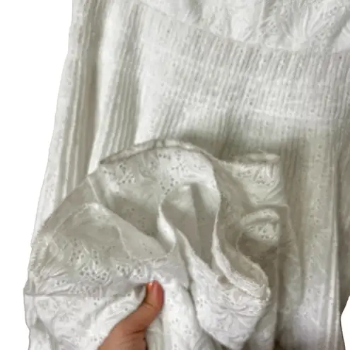 This eyelet midi dress is the perfect summer staple to wear on any warm weathered occasion. V neckline Back zipper closure Sleeveless 55% linen, 45% viscose Dry clean only Imported Approximate measurements taken flat: Pit to pit: 14.5 Waist: 14 Length: 51.5 New with tags, this was a retail display. Multiple dust markings, mostly at hem. May wash off. Please see photos for overall condition.