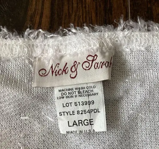 White fuzzy top by Nick & Sarah in good preowned condition. No flaws. Size L Measurements with garment laying flat: Pit to pit: 17” Total length: 21” 96% polyester 4% Lycra Thanks for looking 70k