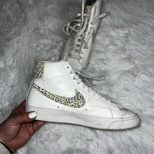 Sleek white high-tops with a bold leopard print swoosh. Perfect for casual wear. Comfortable and sty... Show more