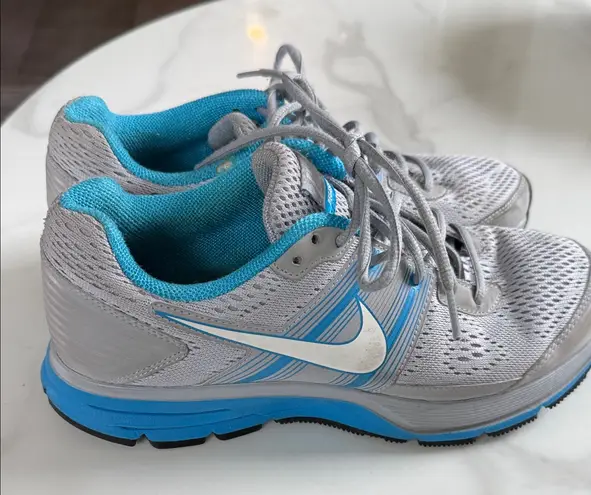 Nike sneakers with a light gray upper and sky blue accents. Perfect for sports and casual outings.