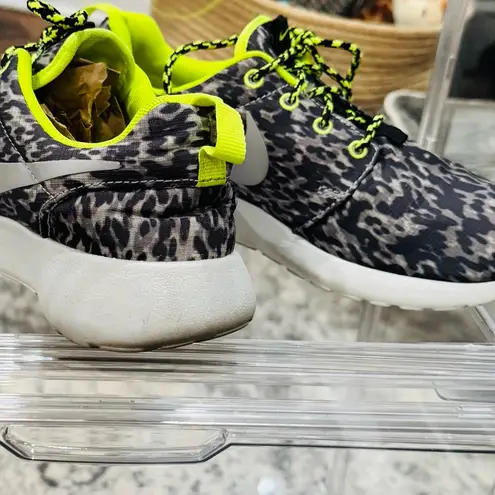Size 6 These pair of Roshe Run sneakers have a black and white print that have a modern pop of neon... Show more