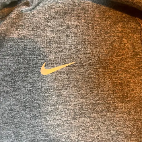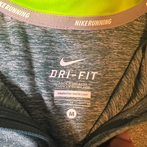 Keywords: Nike, running top, pullover, quarter zip, long sleeve, Dri-FIT, athletic, activewear, thumb holes, gray, neon green, workout, gym, jogging