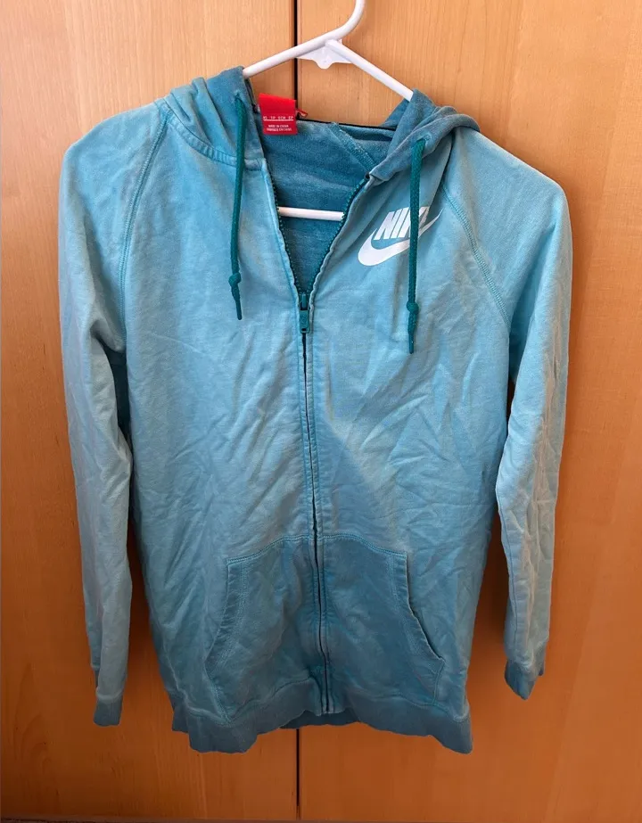 Stylish teal jacket with a zip-up front. Features a hood and Nike logo. Ideal for casual outings. F... Show more